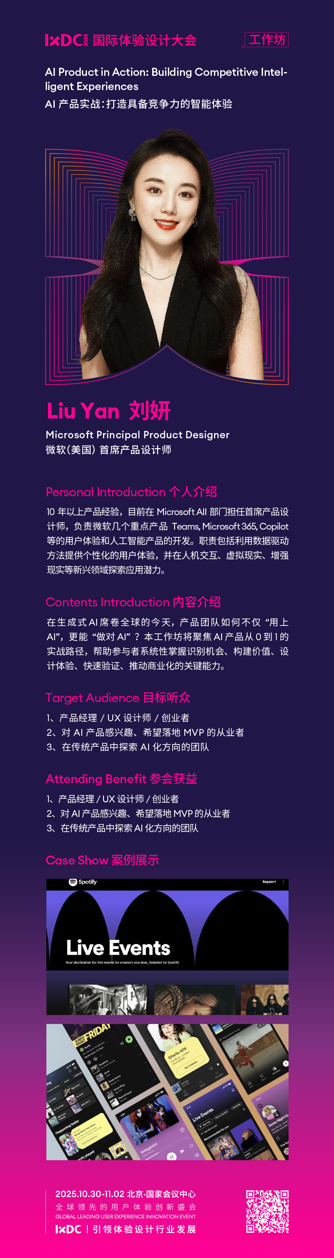 生成式AI浪潮下,“用上AI”已成为产品标配,但“做对AI”才是突破竞争壁垒的核心。如何实现这一跨越?成为当下产品领域亟待解决的关键课题。微软(美国)首席产品设计师刘妍将以10余年在Spotify、微软等企业的实战经验为依托,在IXDC2025国际体验设计大会上,以《AI产品实战:打造具备竞争力的智能体验》为题,拆解AI产品从概念到落地的全流程方法论,助力从业者扎实掌握智能体验打造的核心技能!