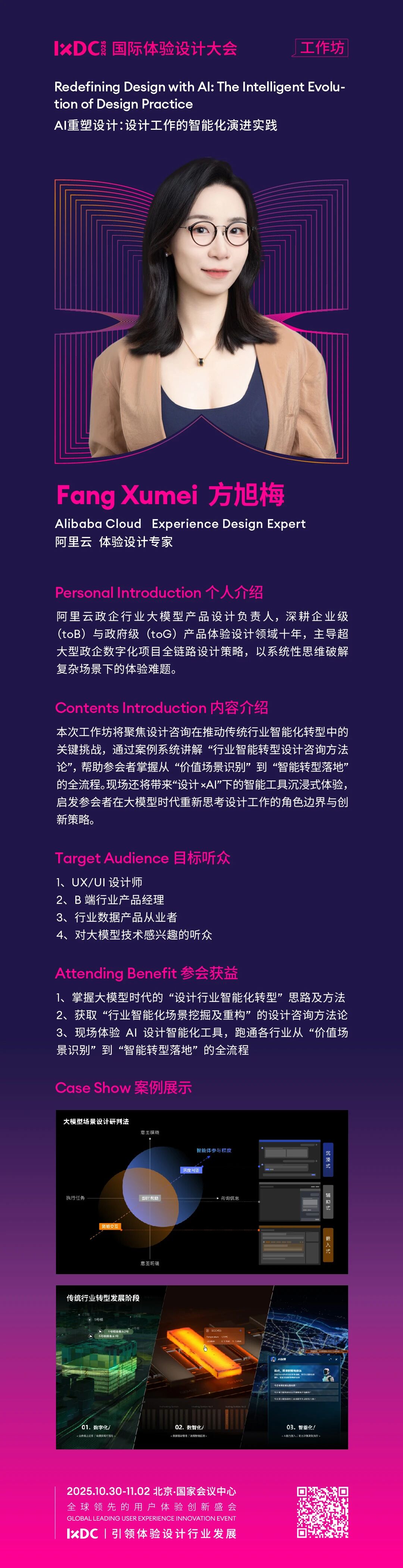 在设计智能化浪潮下,政企服务场景的复杂性、传统行业转型的迫切性,都对设计师提出了更高要求。阿里云体验设计专家方旭梅,带着十年企业级(toB)与政府级(toG)产品设计经验,以及政务、金融、能源等领域智能化转型的实战积累,将在IXDC2025国际体验设计大会中,以《AI重塑设计:设计工作的智能化演进实践》为题,通过标杆案例拆解与沉浸式工具体验,为从业者提供从“价值场景识别”到“智能转型落地”的全流程方法论。