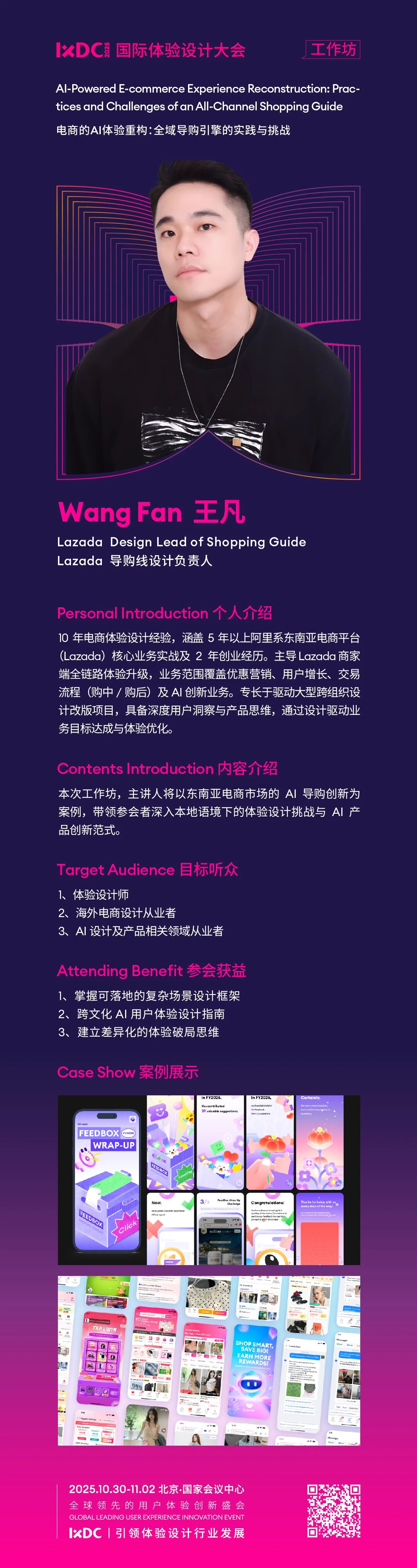 在海外电商市场因多语言、跨文化及地区发展水平不均而面临复杂设计挑战的当下,拥有10年电商体验设计经验的Lazada导购线设计负责人王凡,将出席 IXDC2025国际体验设计大会!他具备5年以上阿里系东南亚电商平台(Lazada)核心业务实战及2年创业经历,主导过Lazada商家端全链路体验升级,业务范围覆盖优惠营销、用户增长、交易流程(购中 / 购后)及AI创新业务,专长于驱动大型跨组织设计改版项目,此次将以《电商的AI体验重构:全域导购引擎的实践与挑战》为题,结合东南亚电商市场AI导购创新案例,带参会者深入探索本地语境下的体验设计挑战与AI产品创新范式。