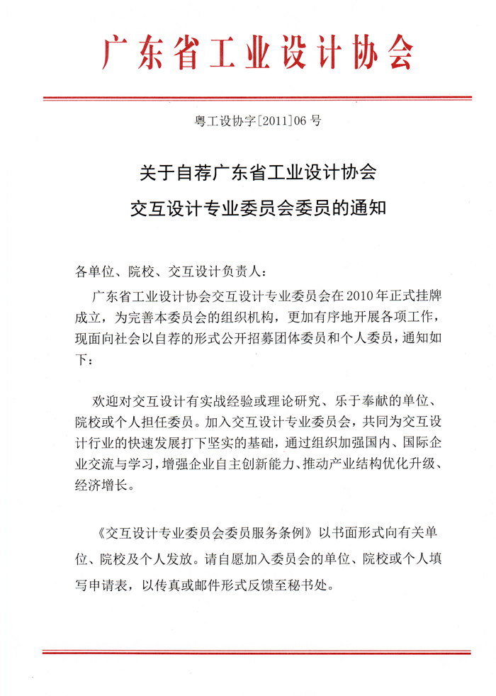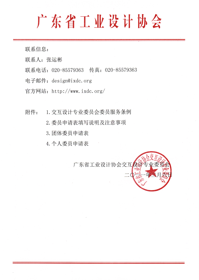 《交互设计专业委员会委员服务条例》以书面形式向有关单位、院校及个人发放。请自愿加入委员会的单位、院校或个人填写申请表,以传真或邮件形式反馈至秘书处。