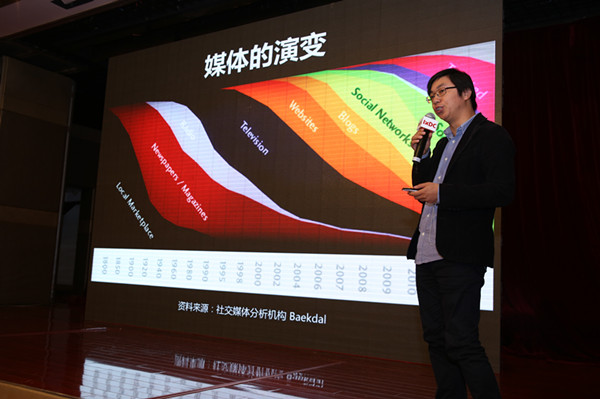现场,主讲人芦义讲述了媒体的演变,指出现在“人人都是媒体源,媒体自主的筛选和聚合”,而媒体内容已经变得社交化、移动化、格式化和脉络化。