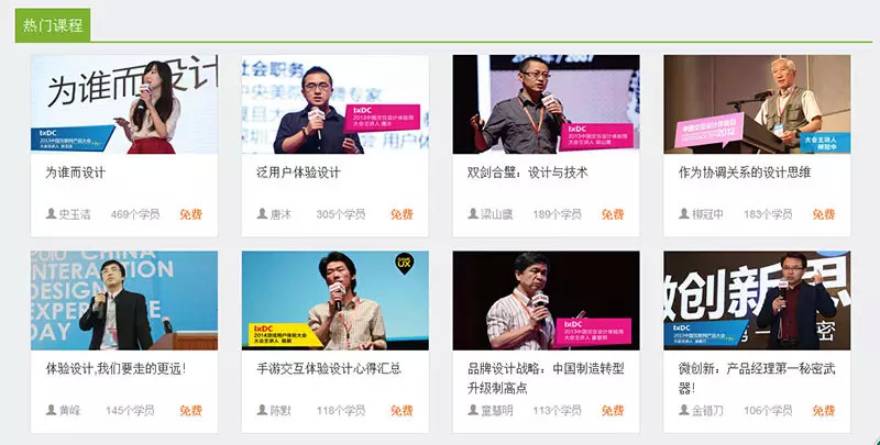 设计大讲堂涵盖设计思维、设计研究、交互设计、设计战略、游戏制作、电子商务、专家观点、活动资讯等丰富的内容。其中,主讲人皆为来自用户体验、交互、视觉、用户研究、管理创新等众多国内外业界翘楚,如青蛙设计创始人Hartmut Esslinger(艾斯林格)、青蛙设计创意总监Rainer Wessler、小米副总裁黎万强、小米用户体验总监唐沐、微软亚洲互联网工程院首席用户体验总监梁山鹰、广州美术学院教授童慧明、江南大学设计学院院长教授辛向阳等。