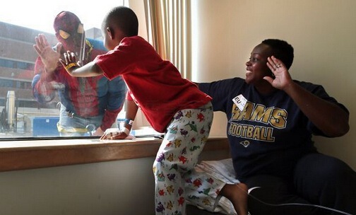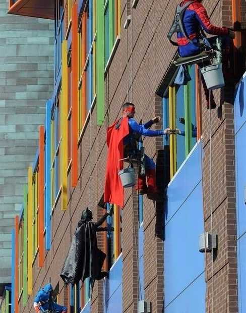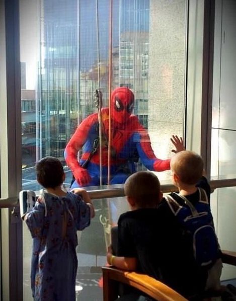 (2012年,国外的一家保洁公司在为当地儿童医院擦窗户时,安排工作人员装扮成蜘蛛侠、超人等英雄形象。每一个楼层的孩子们都激动都不已。太有爱!医疗,需要的是整个社会的良好的信仰环境)