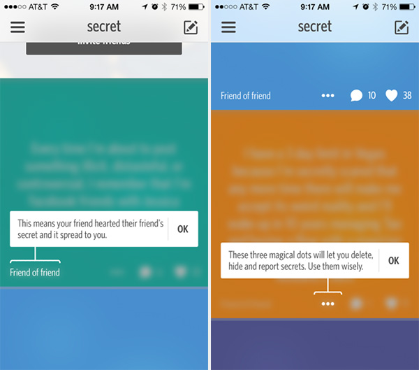 Dropbox和Kindle也将控件放到了弹窗里。弹窗式UI模式对于这类应用的操作非常重要,因为其主要执行对象是数据,因此这一模式就可以让用户清楚看到控件的操作目标。在保证内容可见的情况下,用户可以对筛选选项进行调整或改变字体大小,同时不需要在不同视图间来回切换——所有操作都可以在当前界面完成。弹窗和模拟窗口也可用于显示重要通知或需要用户特别注意的提示,要隐去弹窗需要用户点击或滑动。以Secret和Swarm为例,这两个应用均使用弹窗来说明用户继续操作的预期结果。