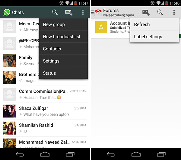 将附加选项和按钮隐藏在溢出菜单中,这样它们就不会干扰主界面。溢出菜单在安卓系统中有着广泛的应用,其主要用于将不常用但与当前内容有相关度的选项和菜单项隐藏到操作栏中。Whatsapp和Gmail等应用对刷新和状态设置等菜单项(这些都是用户需要能够快速使用,但如果放在显眼位置会比较碍事的附加功能)就采用了这种模式。在RelateIQ中,用户可以按住主菜单项来查看子菜单,从而实现快速导航到不同视图。