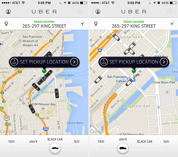 使用滑动手指的方式实现选项切换的显眼、轻松过渡。例如,Uber可让用户在各侧间拖动滑块无缝切换四种出行服务方式。在这一UI设计模式中,其甚至可以放大缩小地图,从而给用户模拟出周边车辆的密度水平,让你能够自动看到各种可行的方案。