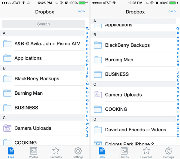 滚动页面时保持顶部、侧边或底部导航栏不变。在某些情况下,页面部分子节的标题也可在滚动时保持固定,或附着到已有的固定导航栏上。以地址簿为例,其中按字母顺序分隔的每个分节(“a”、“b”“c”等)可以在滚动过分节标题时保持在顶部导航栏下方。相册和文件夹类应用多采用这种设计模式。在其他方面,当用户朝着某一方向滚动时,可以让菜单消失,而朝另一方向滚动时则会固定显示。在这方面Pinterest是一个很好的例子,其菜单会在向上滚动时从底部消失,向下滚动时重新出现。这一点与用操作栏(Android机广为采用的模式)存储常用app功能的模式完全不同。