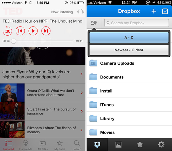 以弹窗的形式显示重要通知和其他信息。这一UI模式的优势在于能够以简洁明了的形式查看其他信息或执行特定操作,同时无需用户退出当前活动。正式的TED应用会以弹窗的形式放置播放控件,同时背景会以半透明形式显示,这样一方面可以让用户知道自己能够对播放器执行相关操作,同时,又不会干扰用户浏览当前内容。