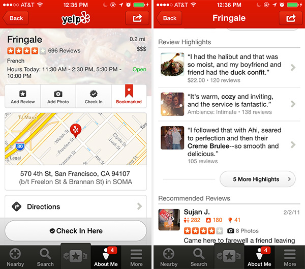 给应用内的大部分甚至全部内容加上链接,让用户能够自由探索寻找自己所需的信息,而不会陷入死循环或被繁冗的超链接文本、多余的按钮、广告宣传等网站上常见的无聊内容所干扰。如果用户希望与应用中的某一部分内容进行交互,他们一般会点击该内容,打开新视图获得详细体验。举例来说,在Yelp中,用户面临着多种选择——他们可以点击底部的按钮,也可以点击内容本身(例如地图或评论)进行浏览。而Flipboard则在用户浏览数字杂志时提供了眼花缭乱的导航方式,例如滑动、点击、手抓退出、撤销、返回等等等等,相比Yelp要复杂得多。