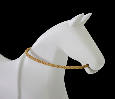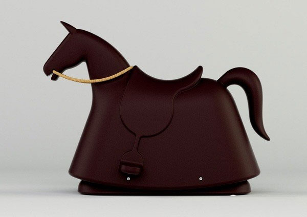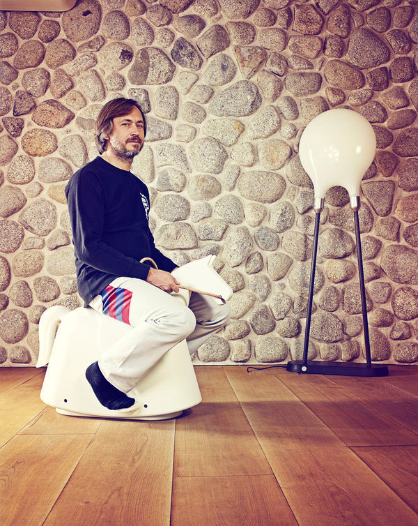 Rocky是Marc2012年设计的玩具,一改传统木马具象和四腿笔直而立的姿态设计师将Rocky设计的更加圆润光滑了一些,像一只披着长长锁子甲的战马。为了和自己设计的Rocky合影,大叔骑上白马,摆出酷酷的姿势。