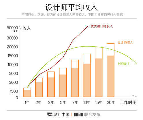 收入状况:综合分析数据显示,目前我国设计行业的人员平均薪资在12000元左右,虽然设计师的收入随着年龄的增长呈上升趋向,但多数设计师的创作能力缺 呈现抛物线状态,即随着时间的推移,一开始逐步增长,8年左右的行业背景是创作的最强时期,在进入管理岗位之后将会逐步下降。且不同区域及行业也有着很大的具体差异(以下为抽样总结数据)。