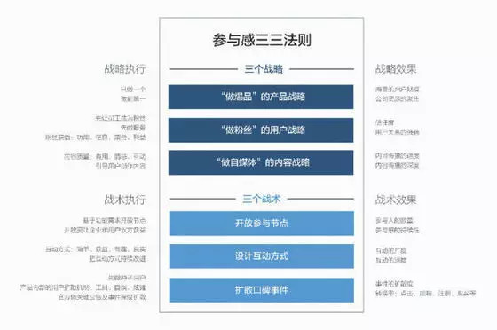 怎么去构建参与感,我们就整理了“参与感三三法则”,三个战术,三个法则。三个战术,第一是开放参与节点,第二是设计互动方式,第三是扩散口碑事件。三个战略是做爆品的产品战略,做粉丝的用户战略,做自媒体的内容战略。所有的公司在今天的这个时代都应该变成自媒体。