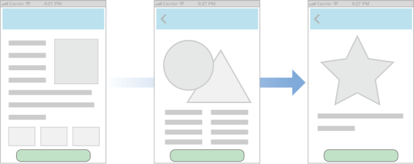 在设计的早期阶段,你可以使用纸面原型或者线框图去呈现主要的视图和控件,并且标明每个页面之间的跳转关系。你可以从线框图测试中获得一些有用的反馈,但是线框图的稀疏性有可能会误导用户。因为用户很难想象当线框被实际内容填满时体验会有什么样的变化。
