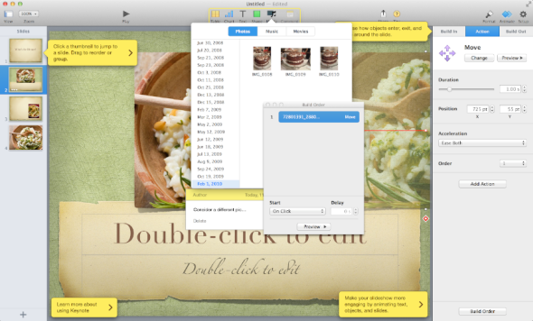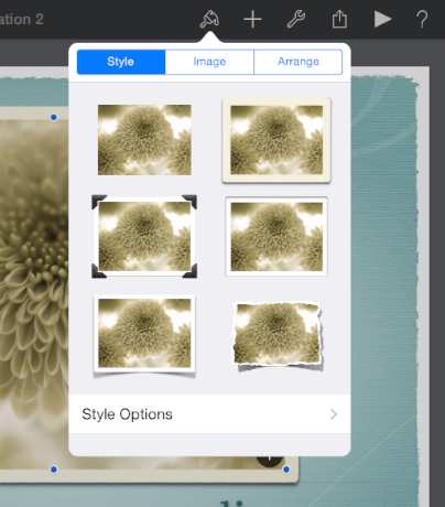 在iPad版的Keynote中,用户可以拖动滑块到一个新的位置,可以扭动旋转一个对象,也可以轻击图片来选中它。iPad版Keynote的响应动画进一步加强了这种可直接操作的印象。例如,用户在移动某个滑块时它通常会暂停,而当它被放置在一个新的位置时,环绕在周围的滑块将会向外扩散给它留出空间。