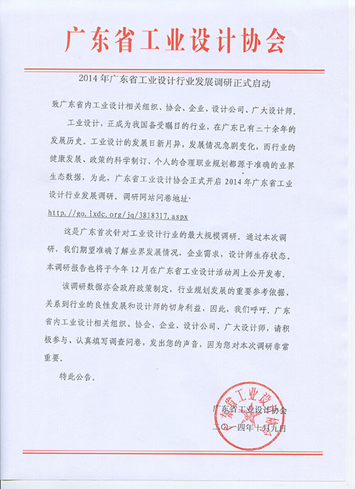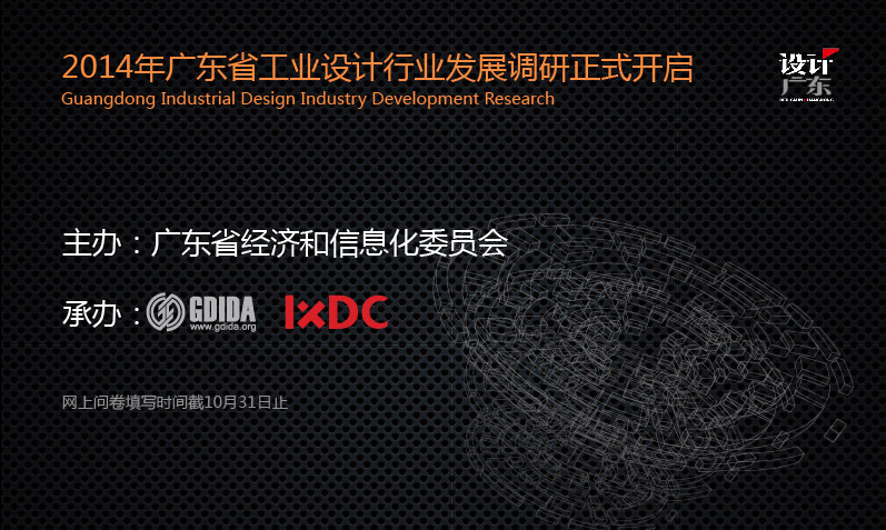 工业设计,正成为我国备受瞩目的行业,在广东已有三十余年的发展历史。工业设计的发展日新月异,发展情况急剧变化,而行业的健康发展、政策的科学制订、个人的合理职业规划都源于准确的业界生态数据,为此,广东省工业设计协会正式开启2014年广东省工业设计行业发展调研。调研网站问卷地址:点击阅读原文。网上问卷填写日期截10月31日止。