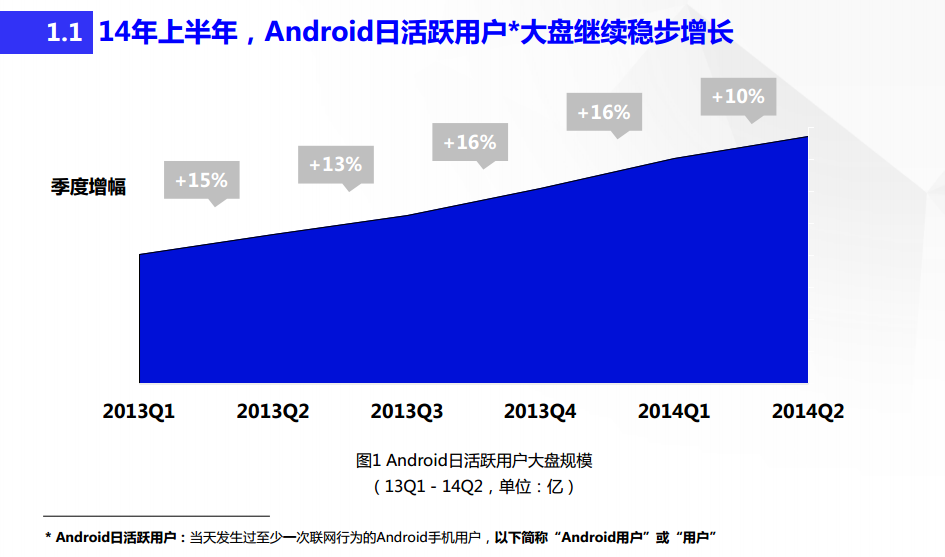 据《百度移动分发报告2014H1》 数据显示,2014上半年Android市场大盘继续稳步增长,日活跃用户累计增长27%,但2014 Q2增速较Q1略为放缓,或预示人口红利正在逐渐消失。