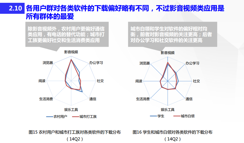 数据显示,不同的用户群体在应用下载偏好差异较大。城市白领和学生偏爱影音视频、社交和学习类应用,农村和城市打工族除影音视频、社交类应用之外,还喜欢通讯和生活消费类应用。总体来看,影音视频应用是最受欢迎的种类。此外,学生和城市白领下载软件多于游戏,更新应用行为高于下载新应用,而农村用户和城市打工族则刚好与之相反。