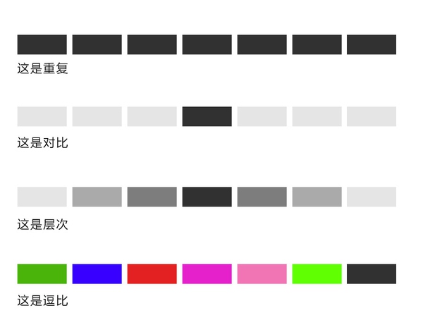 可不是说放几个一样的小方块就是重复了哦,仔细看上图,颜色重复出现,高度、宽度重复出现,元素间距重复出现,可以预见的是,如果我们在最后再加一个小方块,一定还是同样的颜色、高度、宽度、间距,如果不是为了突出,我们不会引入新的元素。