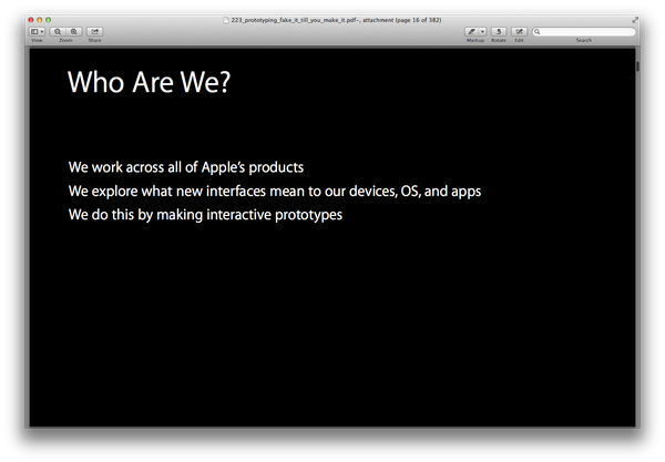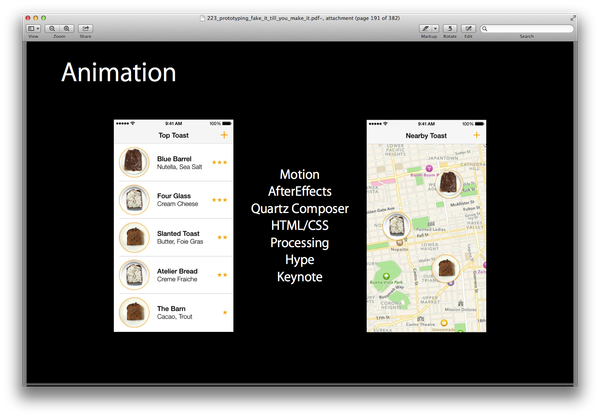 苹果自己有个专门制作原型的团队,他们流窜在各个项目组之间包揽所有的原型制作工作,包括动画和交互。他们的主要工具就是Keynote。