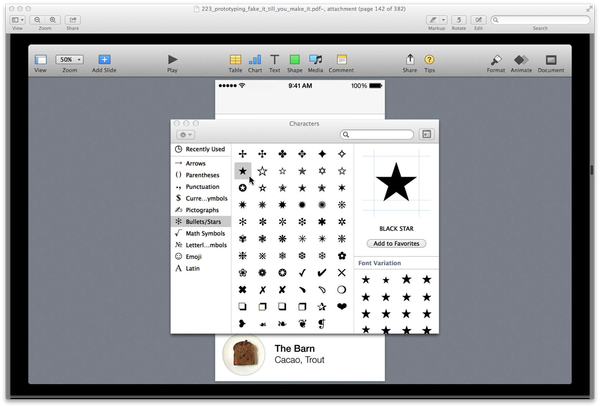 4. 很多人用原型软件是看中那些控件,其实大多数控件还不如自己在Keynote里制作快速。而且Keynote自带了很多标志和Icon,完全不用到处去找了。比如这个例子里的打分用五星,改个黄色就可以了。