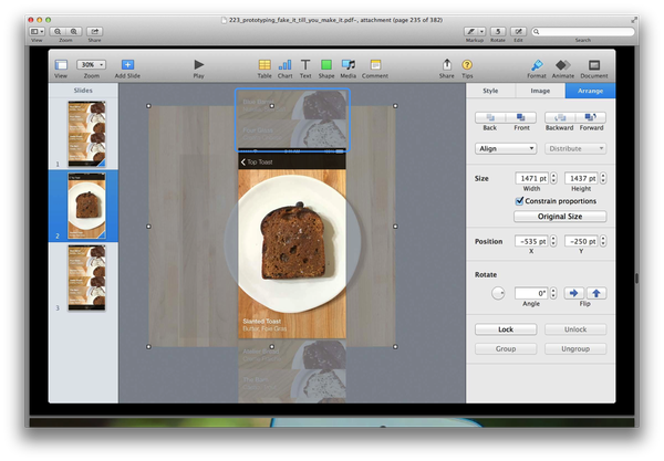 先用画好的线框图或者直接在keynote里用色块布局,keynote提供了多种智能的对齐,布局,格式等等设计方式,整个过程会非常的轻松。比如自动标尺吸附等距等等,比绝大多数原型制作软件都简单人性化。