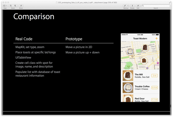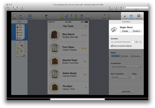 这来自于WWDC 2014 Session Videos里有个视频Prototyping: Fake It Till You Make It ,就是他们指导如何用Keynote做出逼真的交互原型的,这段我也是刚看到,其实一直想补到之前的答案里。下面结合这个视频的截图可以介绍下他们是怎么充分发挥Keynote的特点的。