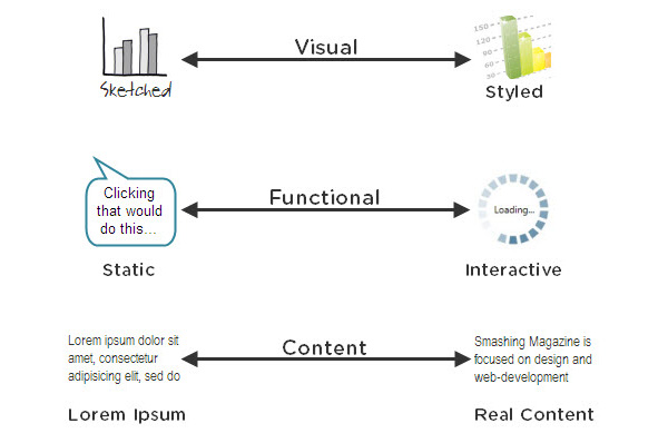 Smashing Magazine的作者Lyndon Cerjeo建议不论保真度如何,原型都应循序渐进地搭建,而不应反复更新换代。一个比较有效果的方法就是先从泛泛的层面开始原型设计,然后深入设计的特定部分提高保真度。举例来说,一个网站原型的初代可以先搭建出主要的登陆页面,在之后的迭代期间逐渐提高保真度并细化网站的各个部分(例如下载时的各个步骤等)。