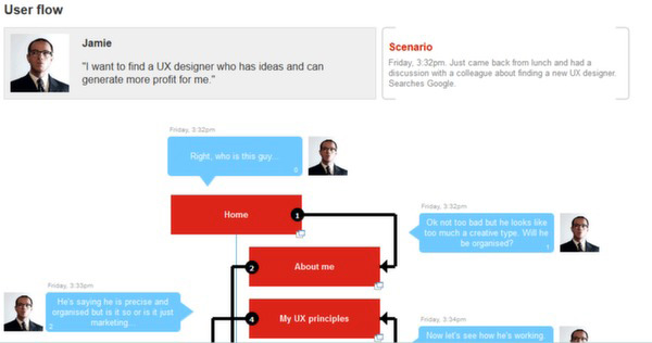根据Wireframes Magazine所介绍,上面所展示的对话气泡用户流程能够在你设计产品交互时有效地帮助你将侧重点放到用户的真实想法和需求上。随着项目不断进展,你很可能会迷失在产品的复杂技术当中。对话气泡用户留出可以让你始终专注于分析阶段所确立的产品特性上。