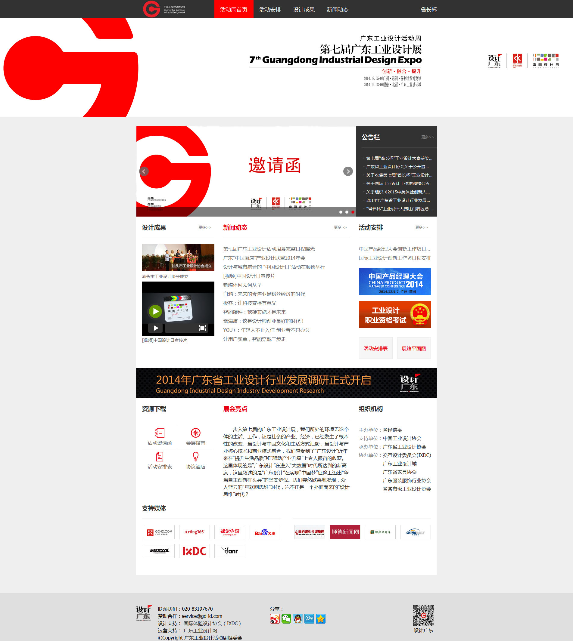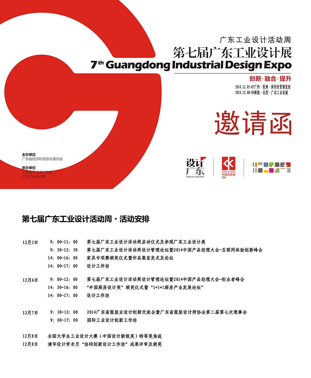 2014年12月5日至9日,第七届广东工业设计活动周,活动周以“设计广东”作为统一的品牌标识,举办包括启动仪式、广东工业设计展、设计管理论坛、中国产品经理大会、家具专项赛颁奖暨作品集首发式、“中国厨房设计奖”颁奖、2014广东省服装业设计创新交流会、全国大学生工业设计大赛(中国设计新锐奖)特等奖评选、清华大学设计学术月“协同创新设计工作坊”成果评选等10余项活动。