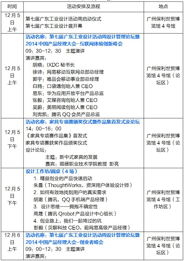 为集中展现大赛成果,彰显广东设计原创力,大赛组委会定于2014年12月5日至9日,举办第七届广东工业设计活动周,活动周以“设计广东”作为统一的品牌标识,包括启动仪式、广东工业设计展、设计管理论坛、家具专项赛颁奖暨作品集首发式、“中国厨房设计奖”颁奖、2014广东省服装业设计创新交流会、全国大学生工业设计大赛(中国设计新锐奖)特等奖评选、清华大学设计学术月“协同创新设计工作坊”成果评选等10余项活动。其中第七届广东工业设计展于12月5日在广州保利世贸博览馆举行,展区面积达1.1万平方米,分“省长杯”获奖作品专区、服装与家具互动体验区、“中国厨房”产业设计联盟主题区、国际厨房品牌区、论坛区和设计工作坊等六大板块。
