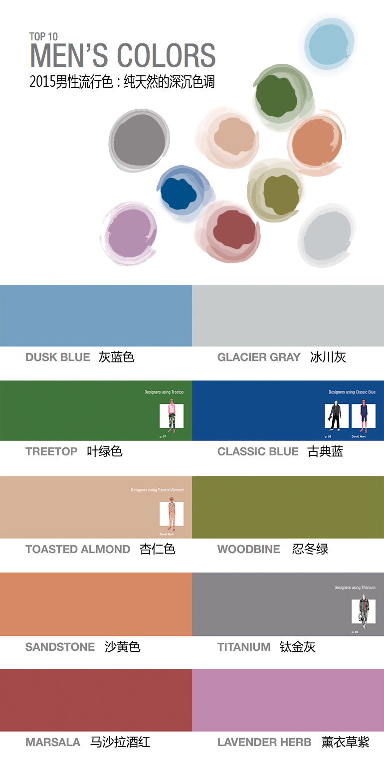 2015的男性流行色有不小的转变(我感觉有些偏女性呀),更加强调即兴搭配,来自自然的色彩和基本色互相混搭,创造了一系列平易近人、成熟老练风格的流行色。