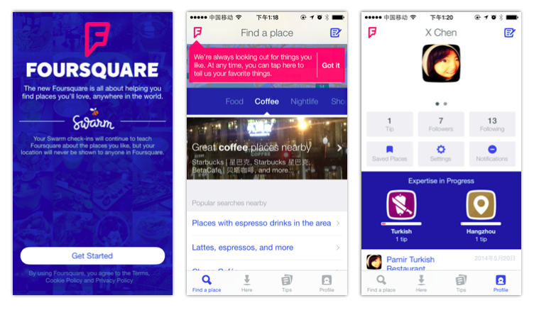 关于流行色在界面中的应用,关键是产品自身需要什么样的气质、希望给用户什么样的印象和感受,颜色本身都是美的,设计的美不美,则看设计师的功力。比如今年流行的闪蓝色(Dazzling blue),我曾一度认为这种饱和度很高的颜色很难用在界面中,特别不能作为主色,可是新改版的Foursquare让我眼前一亮,可以说个性十分鲜明: