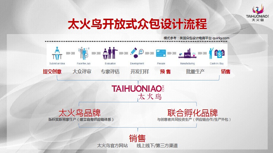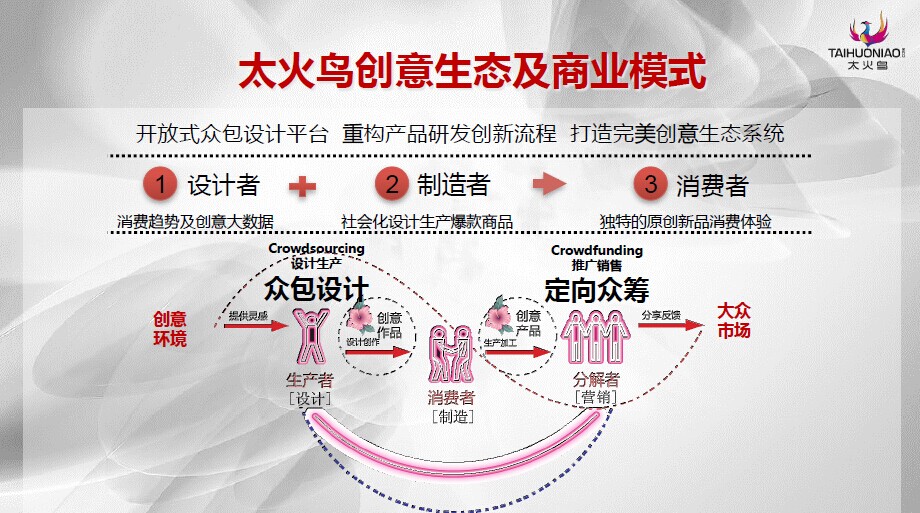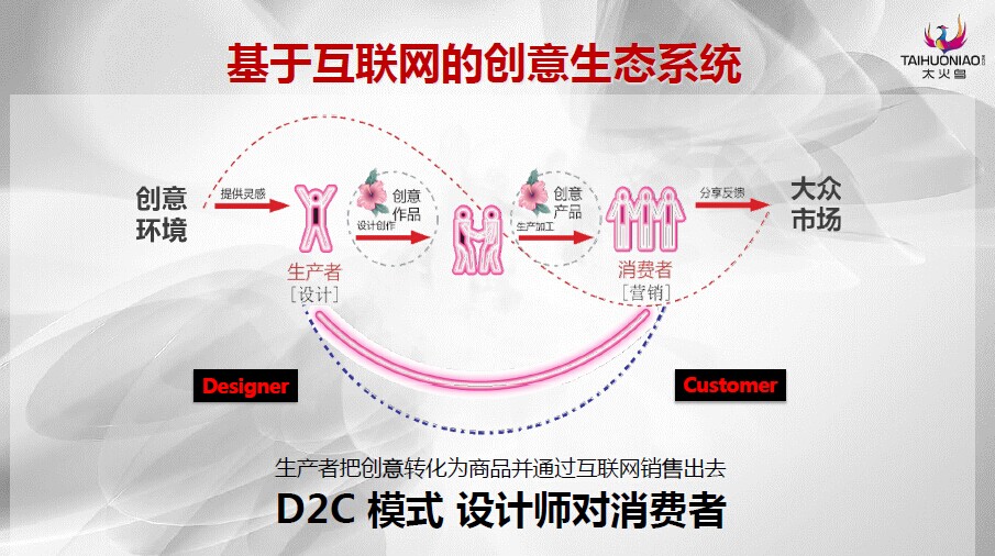 刚才我们讲的什么叫生态系统,基于创意的生态系统是这样的,以前我们作为生产者面向过消费者,但是在互联网的平台之下,设计师是完全有机会的,我们管这个叫B2C的商业模式,就是我们不单纯是一家设计服务的公司,我们去参与到整个的创意的热潮当中,我们每个的整个的生态系统已经完善了,已经专门为创意者提供产业链不同的支持的公司,比如去年拿了100万美金的,这个有点像最早的时候分享的。