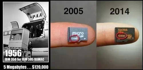 33.最简单一个例子,我们的手机储存卡的容量,左边是1956年的5Mb的硬盘,中间是2005年的128MB的储存卡,右边是2014年的128GB的储存卡