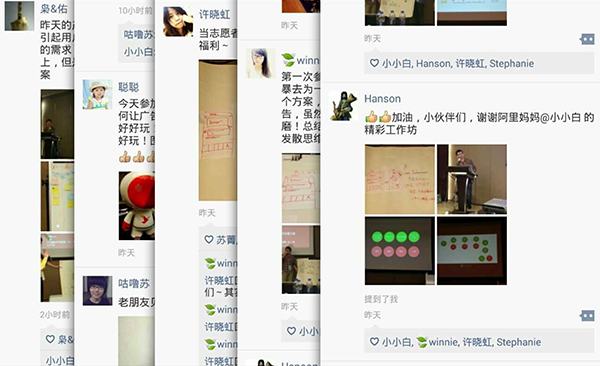 报名我们工作坊的同学参与度非常高,主动分享他们在产品设计工作中的一些困惑和心得。对我们带去的案例分享及设计方法和理念,挺感兴趣,反馈有较强的借鉴价值。我们精心设计了贯穿整个工作坊的练习环节。以游戏化的方式进行了命题设计:挑选一款最喜欢的app,较好地植入淘宝商品广告。由于互动氛围较热烈,工作坊由原定的3小时延长到了4.5小时。