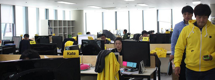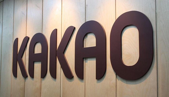 Kakao办公环境。映入眼帘的是很大的Kakao字樣,背板是清爽的原木风格。