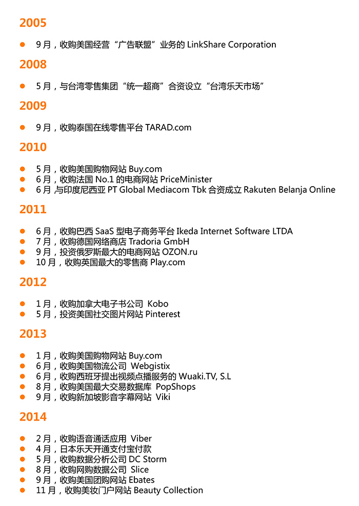 乐天全球化进程不断提速,无论日本国内还是海外,通过收购、投资、并购等资本运作的方式拓展业务是乐天最常使用的手段。