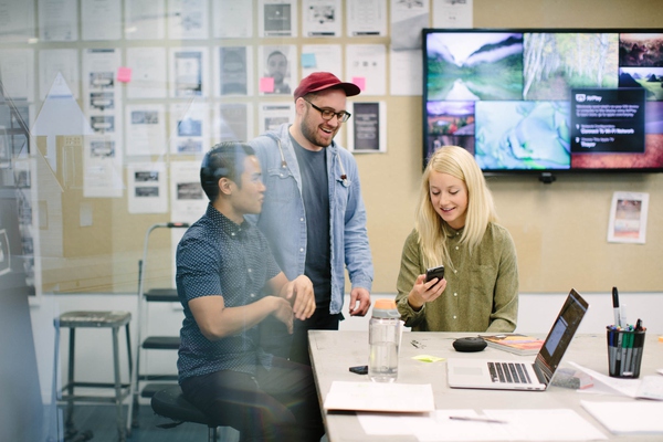 至于建议反馈,我们每周都会正式地在各组举行一次。现在我从事移动设计,移动组每周四会与我们的 CEO Brian,Joe 和一群其它持股人见面,利用一小时时间回顾本周工作并给出和接受建议和反馈,下一周来做出改进,一起推动项目进行。整周期间,我们都会私下与其他设计师们进行一对一交流反馈。」