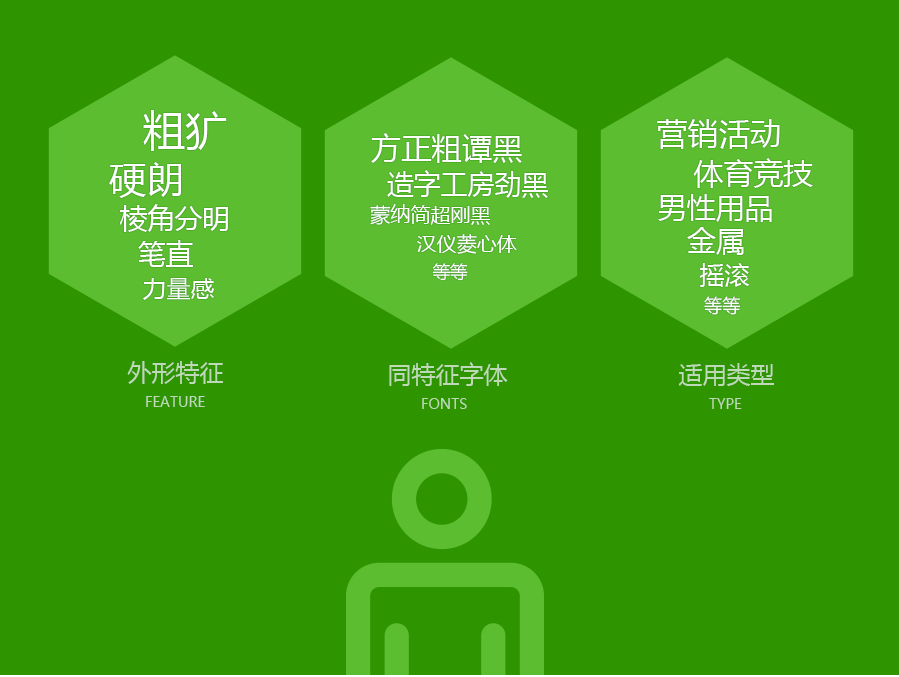 这种图形特征一样可以沿用到文字的上,只要具备粗犷、坚硬、强劲有力、拐角分明、力量感等等图形特征的文字就是男性化的文字。比如下面这款字体,就具备这些特征: