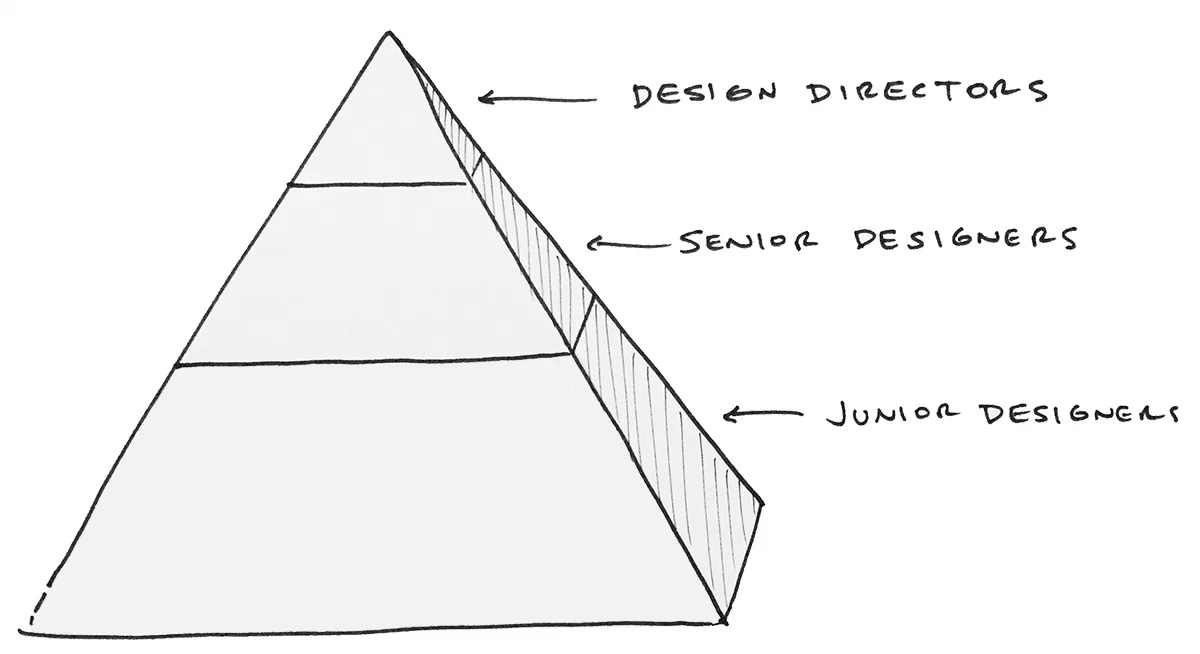 组织架构的好坏能决定一个团队的生死,而我在工作中所总结出来的是一种”代理“模式。(这可能不是一个理想的名称,但是其运行原理要比其名称来的重要。)这种代理模式为金字塔结构,位于金字塔顶部的是团队主管,其次,领导每个小组的成熟设计师位于中部,位于底部的年轻设计师构成了金字塔的基础。