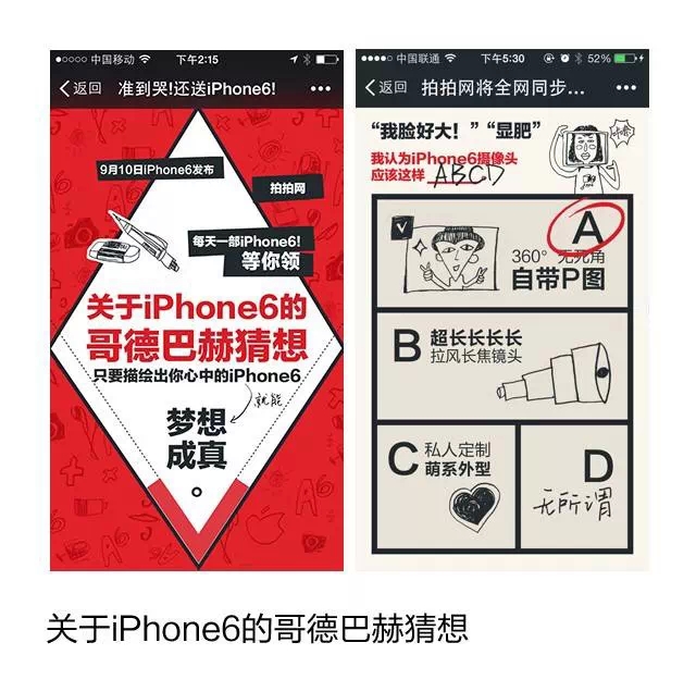 比如拍拍网全球同步发售iPhone6的这个消息要做成H5,如果我们只是做一张炫酷的图片告诉大家我们这里有iphone6分享朋友圈有可能中奖,也会有利益驱动的诱惑让人去转发分享。但通过大家的脑爆,我们将这句话变成“关于Phone6的哥德巴赫猜想”,根据测试结果得出有趣的结论,这样转发的并不是赤果果的求中奖行为,还带着有趣的插图和自己测出来的杀马特范,是不是显得更含蓄更不经意呢。这样最终转发的理由上述1,2,3好像都有了呢。
