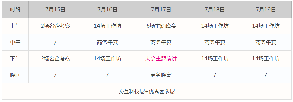 此次大会的内容将包括已有的战略设计、设计管理、设计思维、敏捷体验、用户研究、交互设计、视觉设计等内容模块,也将探讨热门的智能硬件、服务设计等内容,关注的领域包括互联网、移动互联网、设计创业、电子商务、智能家居、消费电子产品、交通、教育、金融、通信、娱乐、医疗、工业制造等。