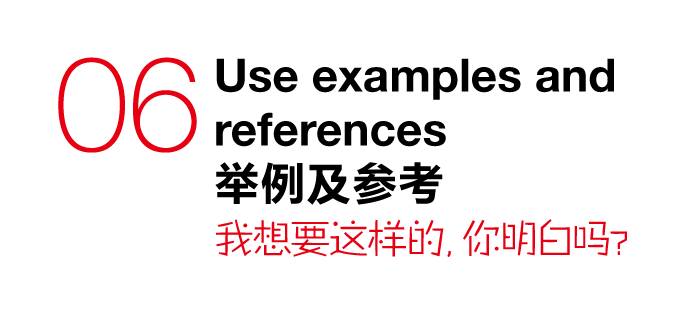每个人都有自己的想法,明白自己喜欢或不喜欢什么。当需要向设计师说明自己的想法时,举例是最好的方式。作为第一步,将你喜欢的或不喜欢的案例与其分享,更重要的是解释个中原因。