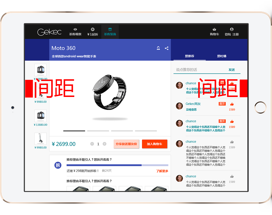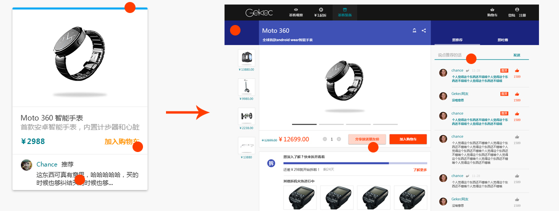 最近接手的项目是Gekec.com的全站改版。Gekec(革客)是Geek和Maker交集,喜欢革新,喜欢技术范儿、新潮的科技消费品,喜欢自己动手创造产品,Gekec.com也就是这类人的聚集地,整个产品囊括电商、资讯(或h5宣传)、拆机、以及社区讨论等各种功能,改版前逻辑复杂,功能繁多。改版开始之初,笔者了解到革客群体时,便认为理性加浓重Geek味道的Google风格或许是最适合Gekec.com的视觉体系,然而复杂的产品逻辑不能给用户带来高效的交互体验和愉悦的使用感受,视觉上也并不能很好的通过Material Design推演并且变化,所以梳理出清晰、轻量且方便视觉统一的产品逻辑成为第一任务。
