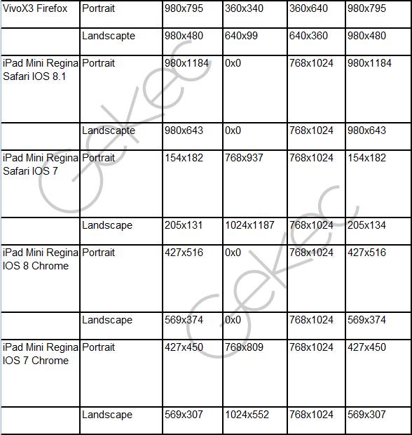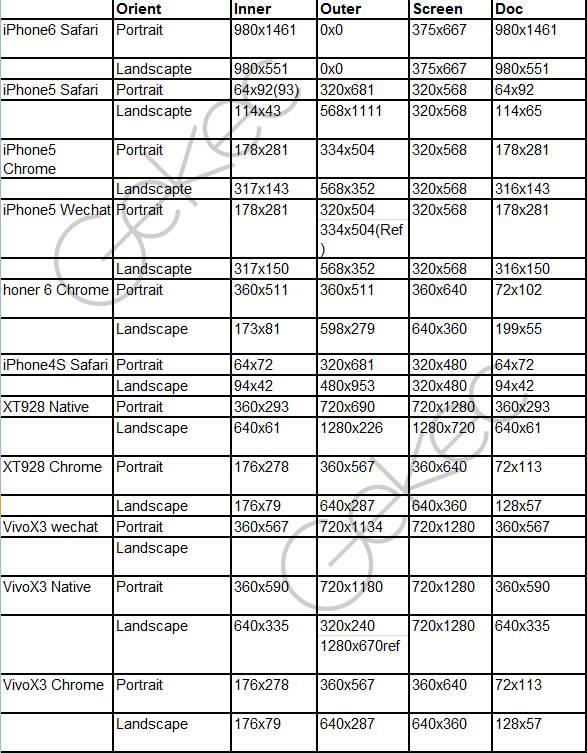 但需要注意的是,响应式网页不同于APP的屏幕适配。网页是沉浸于浏览器的产品,浏览器所启动的屏幕像素才可以被认为是临界点的参考点,为此,笔者做了一些测试,如下表,可以看出不少1080p手机在浏览器中仅启动360px,而神奇的ipad无论是不是retina屏幕,无论是不是mini,均显示1024x768px 。