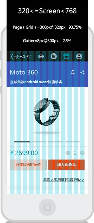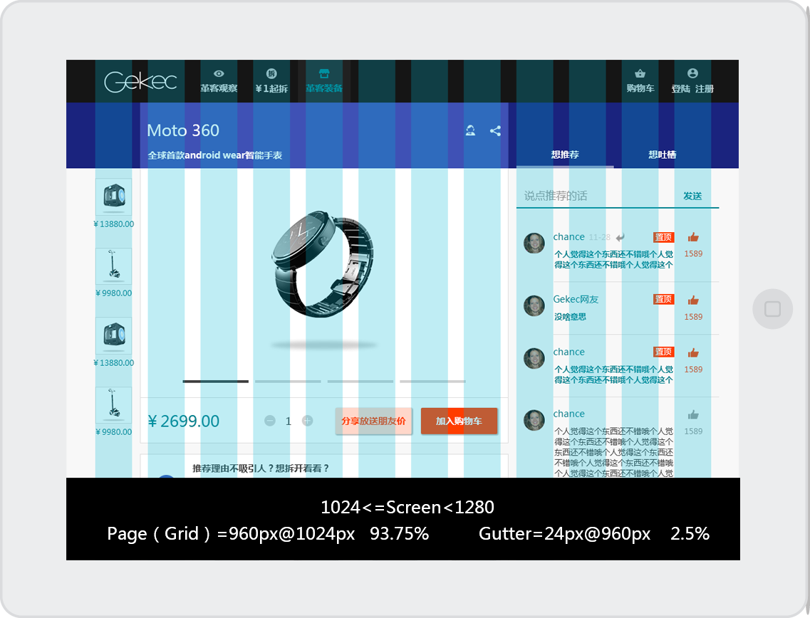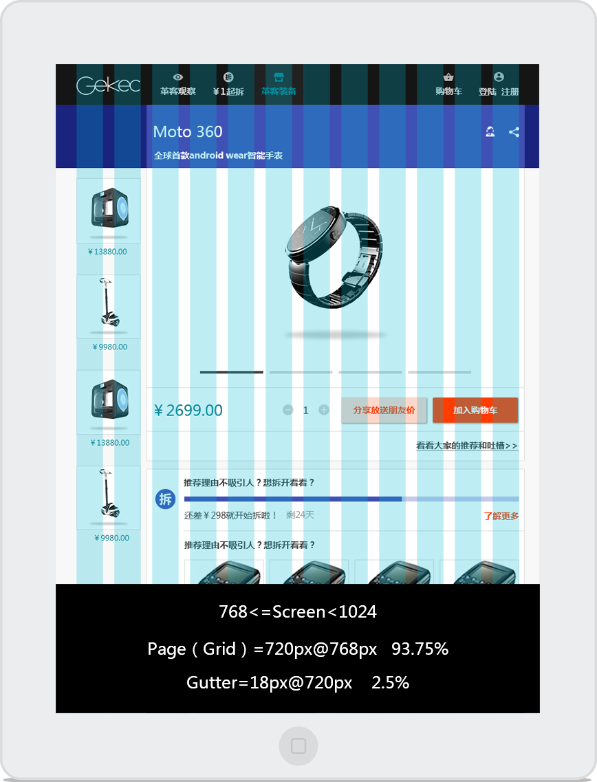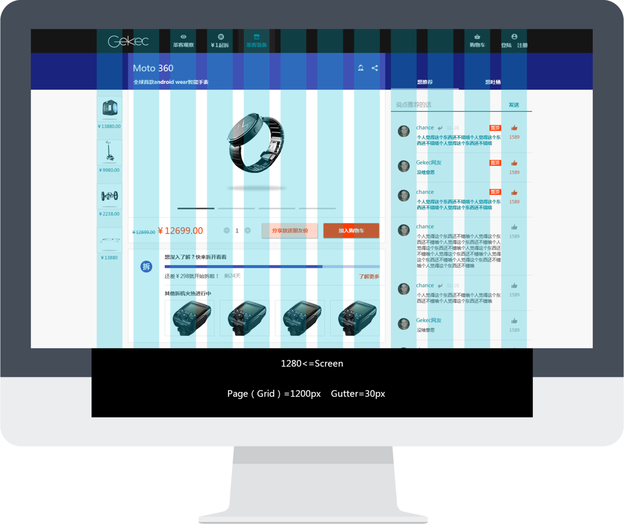 在Gekec.com的项目中,经历产品功能模块的梳理,笔者使用了12栅格系统,目的是能够满足2、3、4、6的页面等分。注:具体栅格系统的建立应因产品和设计所决定,栅格系统并不是万能的,而确定的栅格系统可以为整个响应式设计做规范性参考。