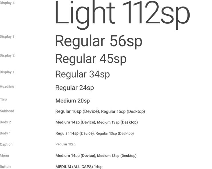Material Design中强调“同时使用过多的字体尺寸和样式,可以轻易的毁掉布局”,并约束了常用的基本样式就是基于12sp、14sp、16sp、20sp的字体排版。