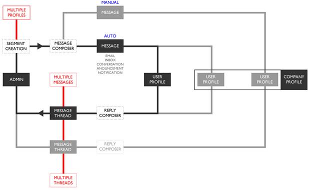 产品的架构不是信息堆砌,它不是一个页面连着这个那个模块和空间,或者一堆死板的演示告诉你点这里是干嘛的,一个交互原型通常就可以很好地处理这些信息。一个更深层次的表达方式,这就是产品的架构图。它能表现出各个模块在整体系统中所处的位置以及它们的联系。而在intercom我们是用这种方式进行架构设计的: