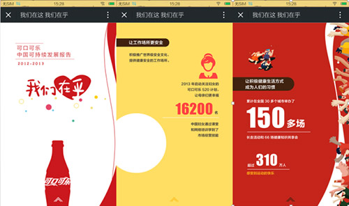 以前段时间席卷朋友圈的可口可乐“我们在乎”为例,它的真身本是一份肩负企业CSR重任的“可持续发展报告”,内容虽力求形象但扔难掩厚重。为了在社交时代更接地气,可口可乐尝试用H5为报告“瘦身美容”:选取报告中的部分核心数据,共十五页画面,直观展现可口可乐的努力,变成适应网络传播特点、特别是移动端观看及分享需求的形式。