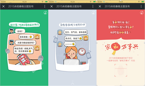 典型例证就是央视春晚的“家和万事兴”:“我们对世界微笑,彬彬有礼,却带着一身疲惫和抱怨回到家里;我们在外拼命售卖自己的观点,却懒得和父母解释我在忙什么(#讲真,内敛含蓄的小编听这台词肉麻兮兮的#)……”H5从一个与父母聚少离多的小故事讲起,通过催人泪下的文案和煽动人心的音乐引发共鸣,然后与“家和万事兴”的主题紧密贴合,最终号召网友“按手印”表达支持。